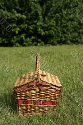 Picnic hamper basket in field