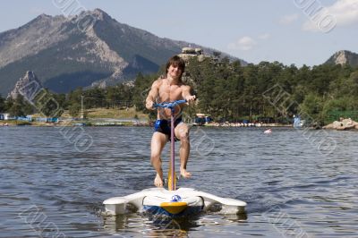 Teenager ride by water bicycle