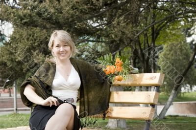 Women with bunch of flowers at the bench in park