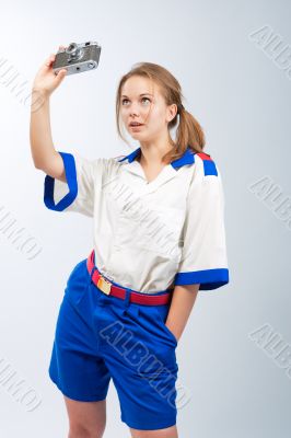 smiling pretty blonde female sailor with camera standing with lifted hand isolated on white